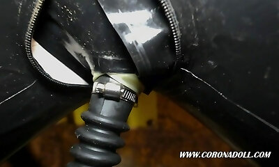 BDSM rubber dolls with total head masks inside gas masks